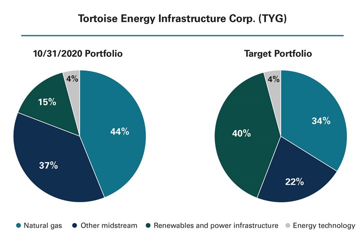 - As of October 31, 2020, approximately 15% of TYG was allocated to renewable and power infrastructure along with energy technology companies. Tortoise Midstream Energy Fund, Inc. (NTG) has a similar allocation.